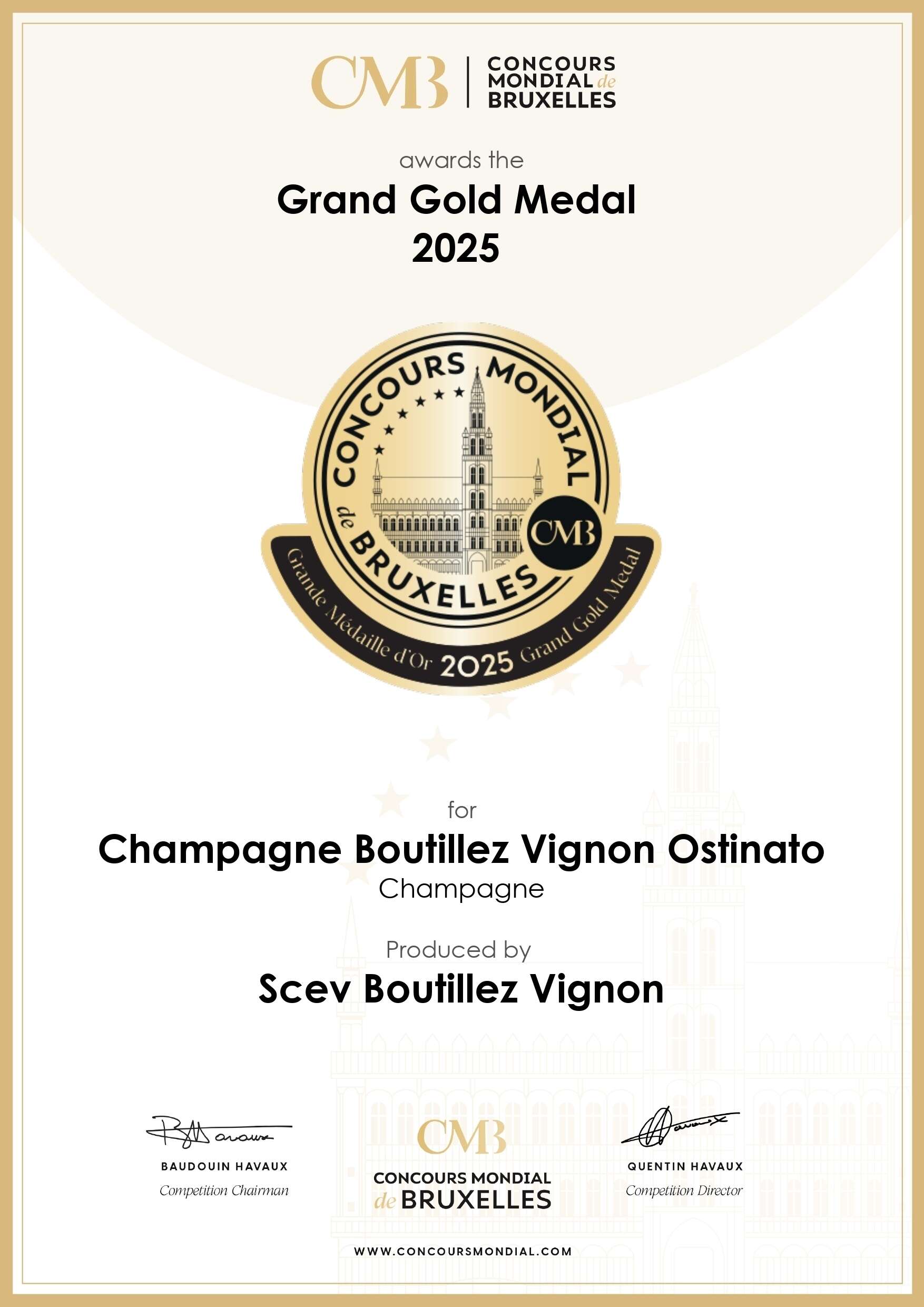 Cette première newsletter est l'occasion de partager avec vous d'excellentes nouvelles récompensant à la fois notre travail à la cave et au vignoble: La cuvée OSTINATO a reçu la Grande Médaille d'or au Concours Mondial de Bruxelles et la cuvée ACOUSTIQUE a quant à elle été distinguée d'une étoile au Guide Hachette 2026.